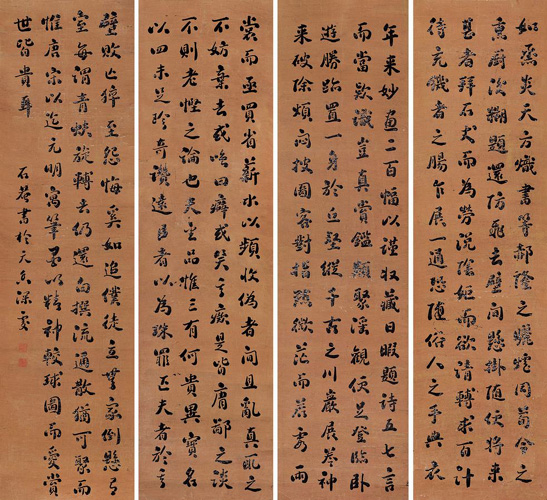 刘墉,1719年生,1804年逝世,山东诸城人。清代书法家。字崇如,号石庵、青原、香岩、日观峰道人。统勋子。乾隆进士、官体仁阁大学士,加太子太保,谥文清。书法浑厚雄劲,得钟太傅、颜鲁公神髓,一时名满天下。在乾隆之际,翁方纲、梁同书、王文治、刘墉并享书法声誉。当时人们称翁、梁、王、刘“四大家”。其书法艺术成就,当推刘墉最高。亦有以来其与翁方纲、成亲王永瑆、铁保并称“翁刘成铁”。包世臣《艺舟双楫》称:“文清少习香光,壮迁坡志,七十以后潜心北朝碑版,虽精力已衰,未能深造,然意兴学识,超然尘外。”近人康有为《广艺舟双楫》称“石庵亦出董(其昌),然大厚思沉,筋摇脉聚,近世行草作浑厚一路,未有能出石庵之范围者,吾故谓石庵集帖学之成也。流传书迹较多。著有《石庵诗集》,刻有《清爱堂帖》。《小楷册》,书于嘉庆元年(1796)。纸本墨迹。凡24行,共360字。各页均纵11.8厘米,横6.9厘米。故宫博物院藏。刘墉的书法,初看圆润软滑,若团团棉花,细审则骨络分明,内含刚劲。刘墉精于小楷,其特色由此件作品可窥一斑。他书的蝇头小楷具有擘窠大字的恢宏气象,结体丝毫不令人觉得拘紧,点画洁净讲究。尤其粗重与纤细交织在一起,加之偶尔揉入行草笔意,使得整个作品在规模的大效果中不乏生动活泼的情趣,这是十分难能可贵的。后世人们称许他的小楷不仅有钟繇、王羲之、颜真卿、苏轼的法度,还深得魏、晋小楷风致,实不为过。
