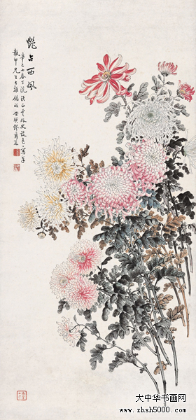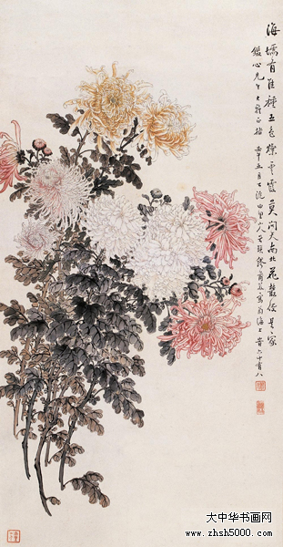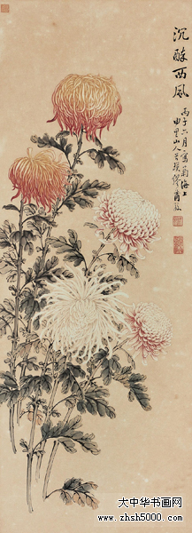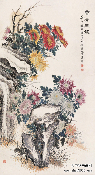 缪谷瑛 (1875~1954),字莆孙,号由里山人、晚香室主。江苏江阴人。为黄山寿再传弟子。工画花卉,最擅写菊。寄居上海,曾任教于仓圣明智大学,为国画教师。时哈同爱俪园中名菊甚众,其课余必往写生。工笔彩绘,极得秋色晚香之盛。经历年积累,笔下所绘之菊达三百余种,时人称之为“画菊专家”。工诗,有《晚香室诗钞》稿。1925年与吴昌硕、王震、张大千、刘海粟等活动于海上书画联合会,1934年又参与婆罗画社活动。其传世作品有1930年作《香清三径图》轴(图录于《现代书画集》)。1950年作《晚香图》长卷,其中名菊有三十二种之多,历时十余寒暑始成。1924年中华书局出版《由里山人菊谱》两册。1936年由于战乱续集画稿不幸遗失,未能出版。1947年《中国美术年鉴》载有《晚香室同门录》。