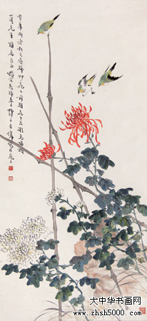 王师子(1885至1950),原名伟,字师梅,四十岁后改名师子,一度寄居上海麦加里,因谐音别署墨稼居士,江苏句容人。历任上海美专、中国艺专、新华艺专等国画教授。治艺谨严,花、鸟、鱼、虫,注意写生。用笔用色,施墨布局,跌宕犹劲,艳而不俗,丽而不浮。书法则以秦权诏版为宗。作诗、治印,均有个人面目。
